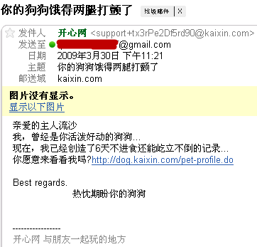 應(yīng)該是開心網(wǎng)(kaixin.com)的寵物功能又升級了,這幾次發(fā)來的郵件內(nèi)容不僅不能讓我開心,反而讓我覺得很惡心。