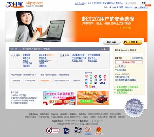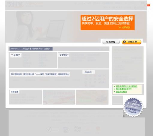 支付寶:大banner分為2塊,左邊是代表著用戶的大美女,右邊是體現(xiàn)實(shí)力的宣言“超過2億用戶的安全選擇”,輔助小字為:共享簡單、安全、快捷的網(wǎng)上支付體驗(yàn),具有親合力的美女,醒目的大標(biāo)語,傳達(dá)給用戶的信息,支付寶的內(nèi)容構(gòu)思很明顯比財(cái)付通更直接有效。