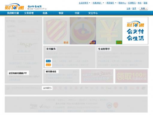 財(cái)富通:支付服務(wù)(含個(gè)人和企業(yè)),生活好幫手,還沒有財(cái)富通帳戶,支付好幫手,合作銀行,共5塊主要內(nèi)容,兩個(gè)廣告區(qū)。