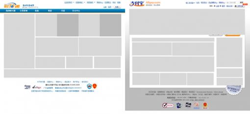 支付寶:兩個(gè)大按鈕(輕松體驗(yàn)、免費(fèi)注冊),動(dòng)態(tài)信息區(qū),個(gè)人用戶,企業(yè)用戶,流程演示,合作伙,公司動(dòng)態(tài),新手問題,圓形標(biāo)簽圖,兩個(gè)廣告區(qū)。