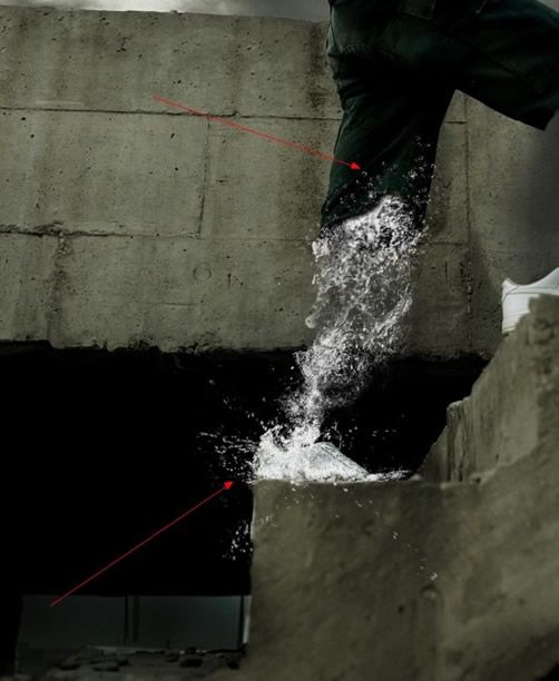 我們將下載的素材進(jìn)行適當(dāng)?shù)淖冃纹春?,形成左腿的形狀,注意邊緣的飛濺效果,這樣才有動感和真實感,如圖
