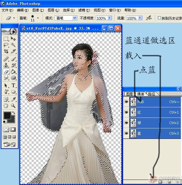 婚紗摳圖方法有很多,通道摳圖是個不錯的選擇。大致過程:先需要用鋼筆等工具把人物部分摳出來包括婚紗部分。然后把摳出的人物圖層復(fù)制一層,在通道選區(qū)婚紗部分較為清晰的通道并調(diào)出選區(qū),回到圖層面板后把選區(qū)反選按刪除高光部分以外的圖像,得到的圖像就是我們摳出的婚紗部分,后期再適當(dāng)調(diào)亮即可。