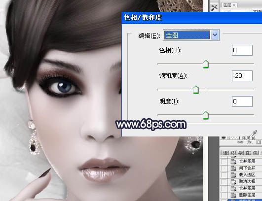 8、選擇畫筆工具 顏色如圖。給人物添加眼影。蓋印一個(gè)圖層,調(diào)整下色相飽和度。