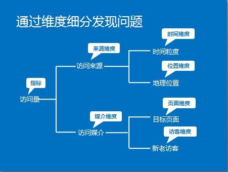 什么是細(xì)分呢?細(xì)分是在流量分析時(shí)最常用的方法。通常也是最有效的方法。細(xì)分是指通過不同維度對(duì)指標(biāo)進(jìn)行分割。查看同一個(gè)指標(biāo)在不同維度下的表現(xiàn)。進(jìn)而找出有問題的那部分指標(biāo)。對(duì)這部分指標(biāo)進(jìn)行優(yōu)化。這是一個(gè)流量細(xì)分的示意圖。指標(biāo)是訪問量,就是我們常說的流量。通過在來源維度,媒介維度,時(shí)間維度,位置維度等維度下我們可以對(duì)訪問量進(jìn)行單獨(dú)或者重疊的多維度細(xì)分。