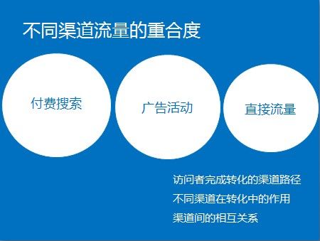還記得前面的象限圖嗎,那里我們留下了一個(gè)問題,第三象限質(zhì)較低的流量如何處理,是否可以直接砍掉。答案是不能。為什么呢?因?yàn)樵L問者在整個(gè)的購買過程中會(huì)穿梭于多個(gè)不同的流量渠道中,他們使用不同的工具對(duì)信息和商品進(jìn)行查詢,對(duì)比并作出決策。并且越是價(jià)值高的商品,訪問者需求的信息越多,決策時(shí)間越長。而每個(gè)渠道在訪問者的轉(zhuǎn)化的過程中也會(huì)扮演不一樣的角色。有些渠道吸引注意,樹立品牌形象。例如門戶的banner廣告,有些提供精準(zhǔn)信息,例如搜索引擎廣告。而有些幫助訪問者進(jìn)行決策,比如比價(jià)和評(píng)論。因此,我們?cè)谔幚砬懊娴膯栴}時(shí),對(duì)于質(zhì)比較差的第三象限流量渠道需要分析這個(gè)渠道與其他渠道間的關(guān)系,也就是渠道間的重合度。以及這個(gè)渠道在整個(gè)轉(zhuǎn)化過程中扮演的角色。這里我們可以看到,廣告活動(dòng),付費(fèi)搜索和直接流量間有明顯的重合。直接砍掉廣告活動(dòng)流量,或者降低廣告投放都有可能會(huì)影響另外兩個(gè)渠道的表現(xiàn)。