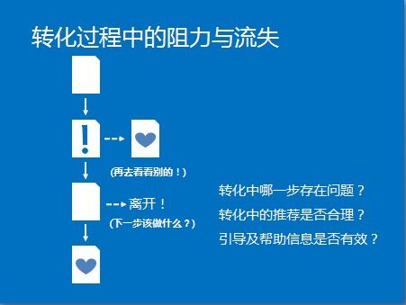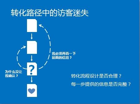 最后,我們來看下轉(zhuǎn)化分析。轉(zhuǎn)化渠道與前面的頁面導(dǎo)航很像,區(qū)別在于轉(zhuǎn)化渠道通常是一個(gè)目標(biāo)非常明確的封閉渠道。在這個(gè)渠道中我們希望訪問者一路向前,不要回頭也不要離開,直到完成轉(zhuǎn)化目標(biāo)。對(duì)于轉(zhuǎn)化渠道,我們主要進(jìn)行兩部分的分析,分別是訪問者的流失和迷失。下面先來看第一部分:轉(zhuǎn)化過程中的阻力的流失。轉(zhuǎn)化的阻力是造成訪問者流失的主要原因之一。這里的阻力包括錯(cuò)誤的設(shè)計(jì)和錯(cuò)誤的引導(dǎo)。